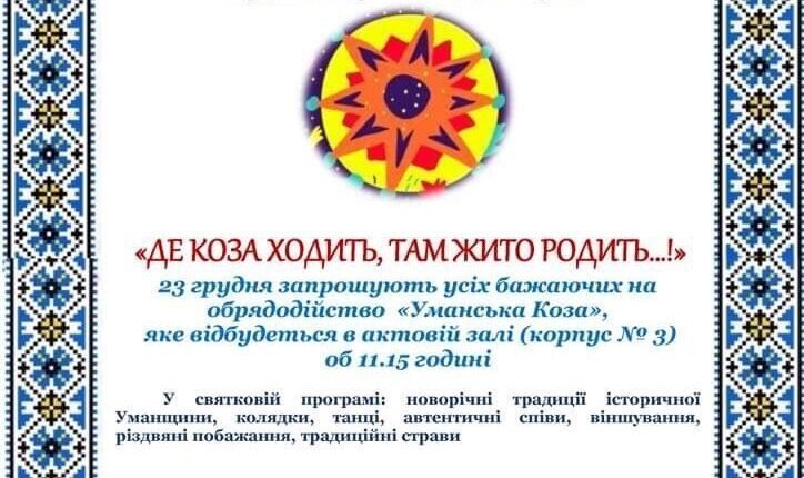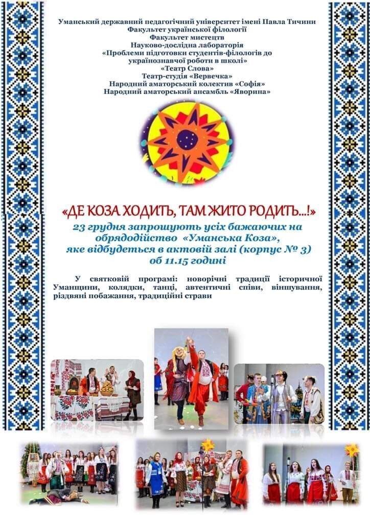 Факультет української філології, факультет мистецтв, науково-дослідна лабораторія «Проблеми підготовки студентів-філологів до українознавчої роботи в школі», «Театр слова», театр-студія «Вервечка», народний аматорський колектив «Софія», народний аматорський ансамбль «Яворина» УДПУ імені Павла Тичини 23 грудня о 11.15 годині запрошують усіх бажаючих в актову залу (корпус №3, Садова,28) на обрядодійство «Уманська коза». У святковій програмі: новорічні традиції історичної Уманщини, колядки, танці, автентичні співи, віншування, різдвяні побажання, традиційні страви.