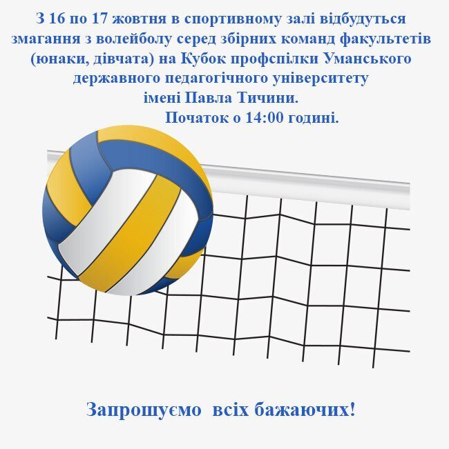 З 16 по 17 жовтня в спортивному залі відбудуться змагання з волейболу серед збірних команд факультетів (юнаки, дівчата) на Кубок профспілки Уманського державного педагогічного університету імені Павла Тичини. Початок о 14:00 годині.