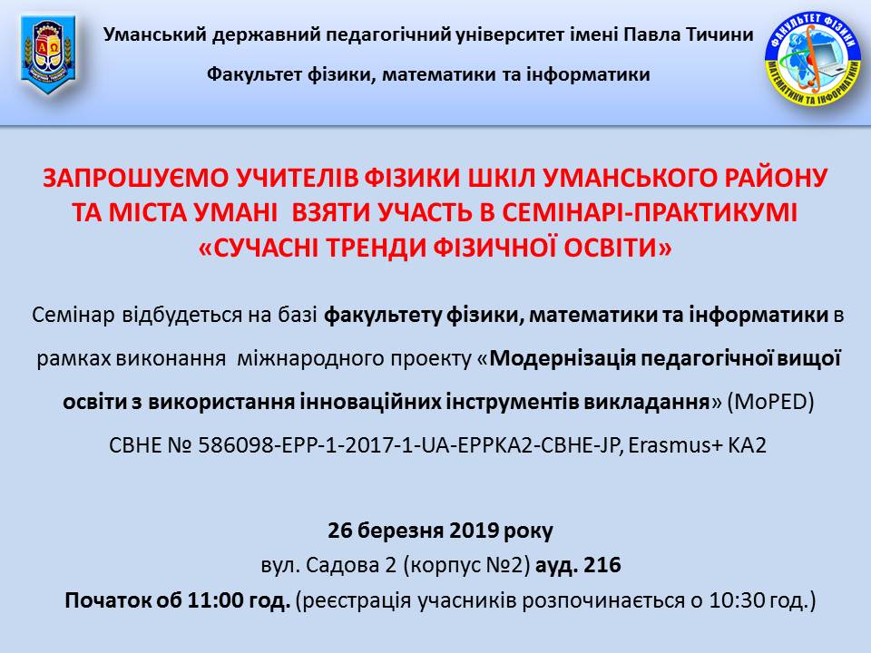 Запрошуємо вчителів фізики шкіл Уманського району та міста Умань взяти участь в семінарі-практикумі «Сучасні тренди фізичної освіти», який відбудеться 26 березня 2019 рокув аудиторії No 216 корпусу No2 (факультет фізики, математики та інформатики) Уманського державного педагогічного університету імені Павла Тичини.