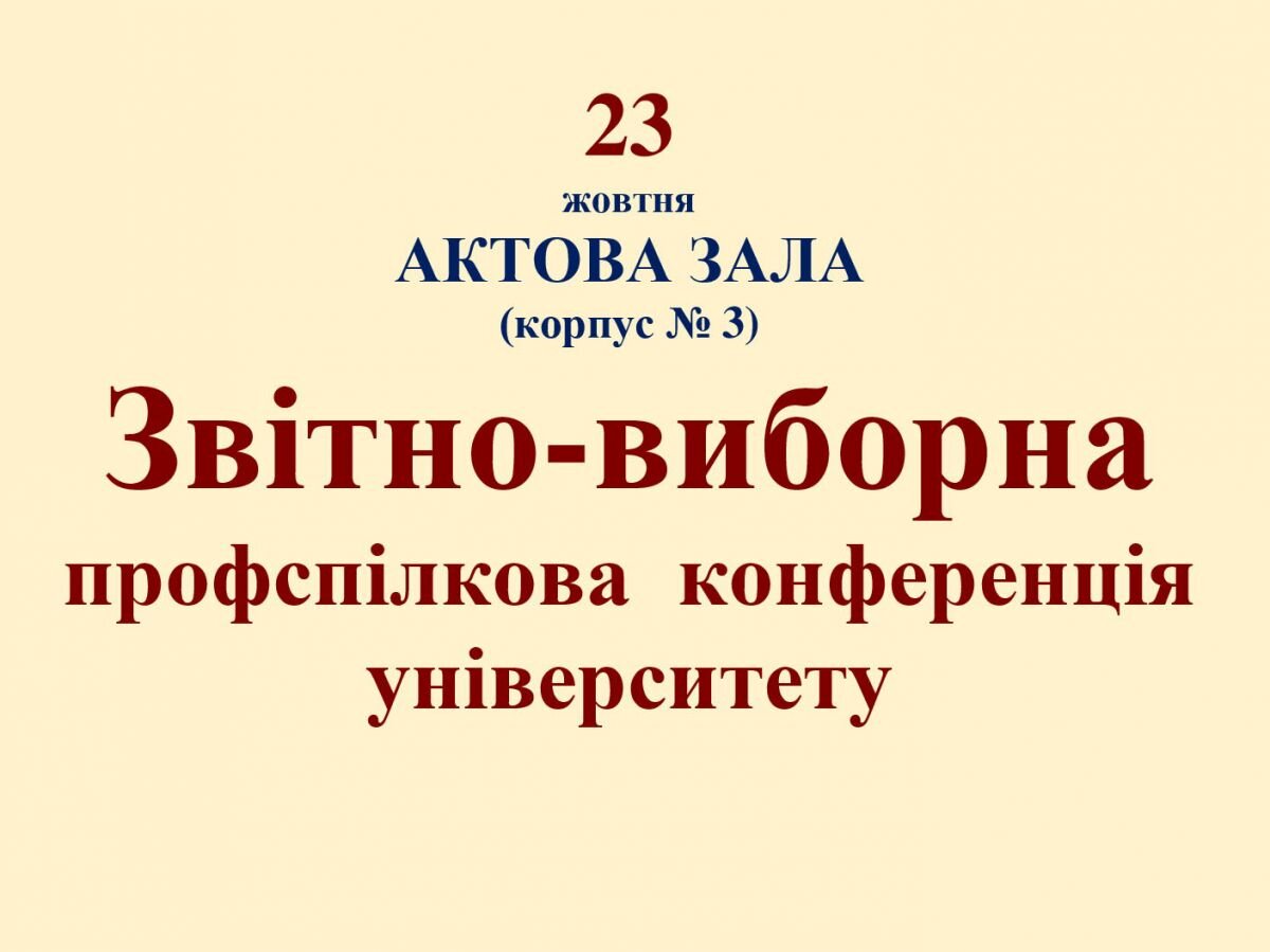 23 жовтня о 13.00 годині в актовій залі університету відбудеться звітно-виборна профспілкова конференція університету. Запрошуються делегати конференції.