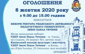 8 жовтня 2020 року з 9.00 до 15.00 години проходитимуть вибори ректора Уманського державного педагогічного університету імені Павла Тичини. Місця проведення виборів: УДПУ імені Павла Тичини – м. Умань, вул. Садова, 26 (корпус №3, актова зала); Канівський коледж культури і мистецтв...