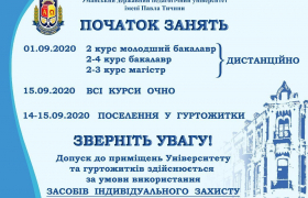 З метою дотримання рекомендацій щодо організації протиепідемічних заходів у закладах освіти в період карантину в зв’язку поширенням коронавірусної хвороби (COVID-19) початок І семестру 2020\2021 н.р. в Уманському державному педагогічному університеті імені Павла Тичини для студентів 2...