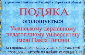 В Уманському державному педагогічному університеті імені Павла Тичини Головним управлінням Національної поліції в Черкаській області в межах вступної кампанії на 2020 рік до ЗВО проведено профорієнтаційний захід для студентів, учнів закладів освіти м. Умань та Уманського району У...