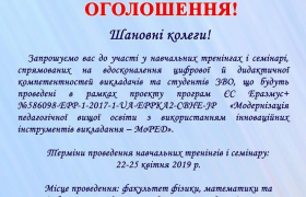 У рамках реалізації міжнародного проекту програми ЄС Erasmus + KA2 № 586098-EPP-1-2017-1-UA-EPPKA2-CBHE-JP «Модернізація педагогічної вищої освіти засобом використання інноваційних інструментів викладання – MoPED» на базі факультету фізики, математики та інформатики...